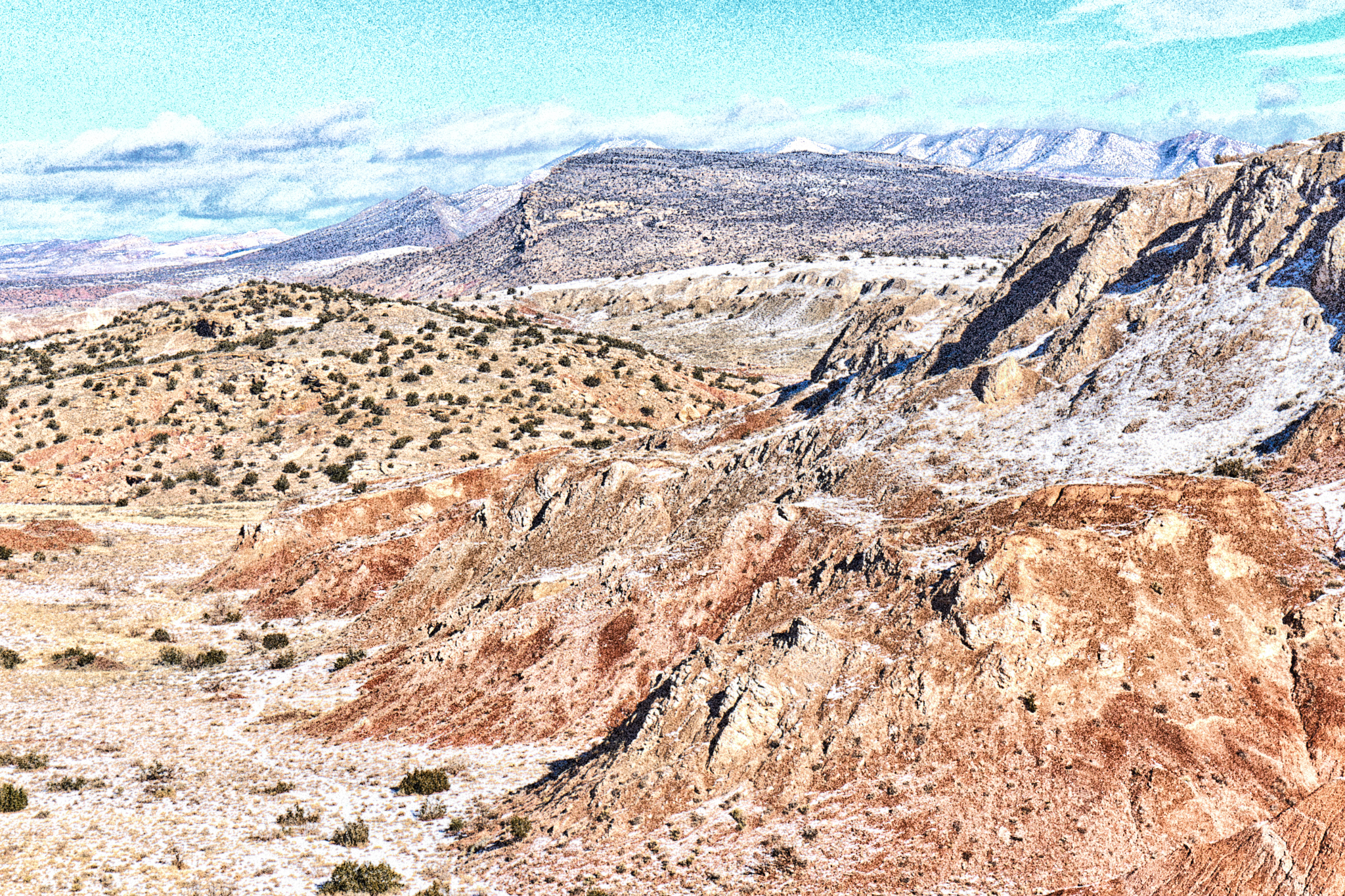This was a fun little project which came together quickly. The photo of the southern terminus of the Rocky Mountains, near Jemez, New Mexico, was taken the day before Christmas 2018, and it had snowed a few inches the night before. The composition itself was pleasing to my eye: lots of complimentary curving lines, a variety of textures ranging from the sandy badlands in the foreground, to Juniper studded hills, the distant high and snowy Rocky Mountains, capped off with a brilliant blue sky and some gauzy low clouds hugging the high mountains.